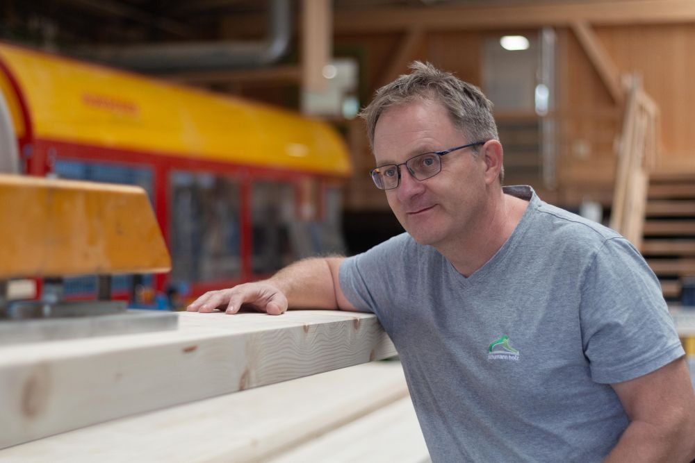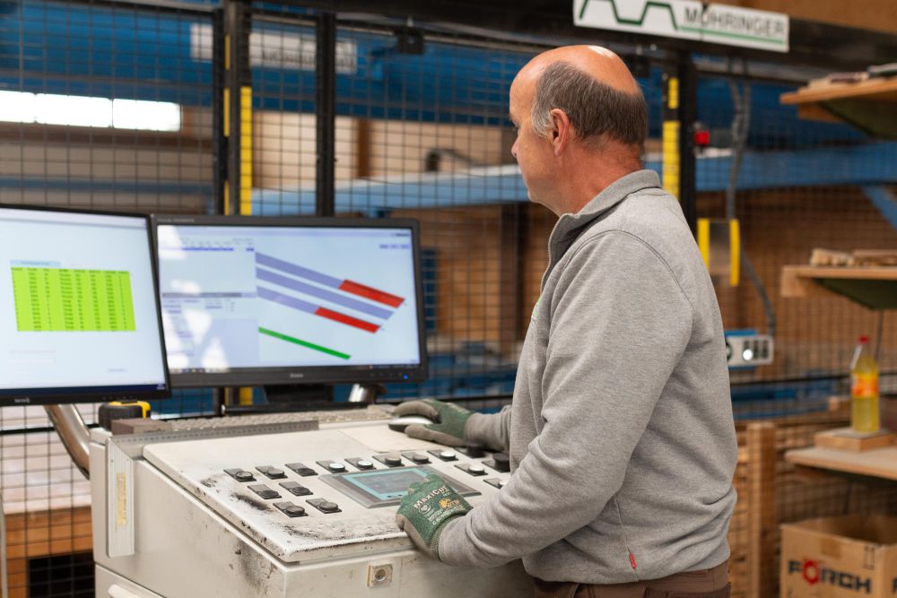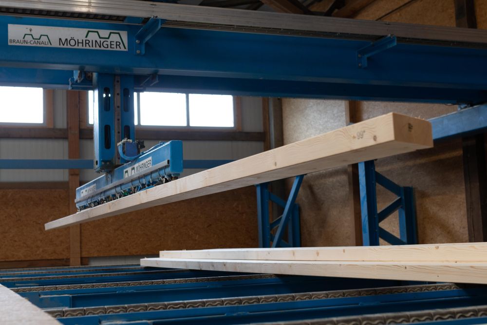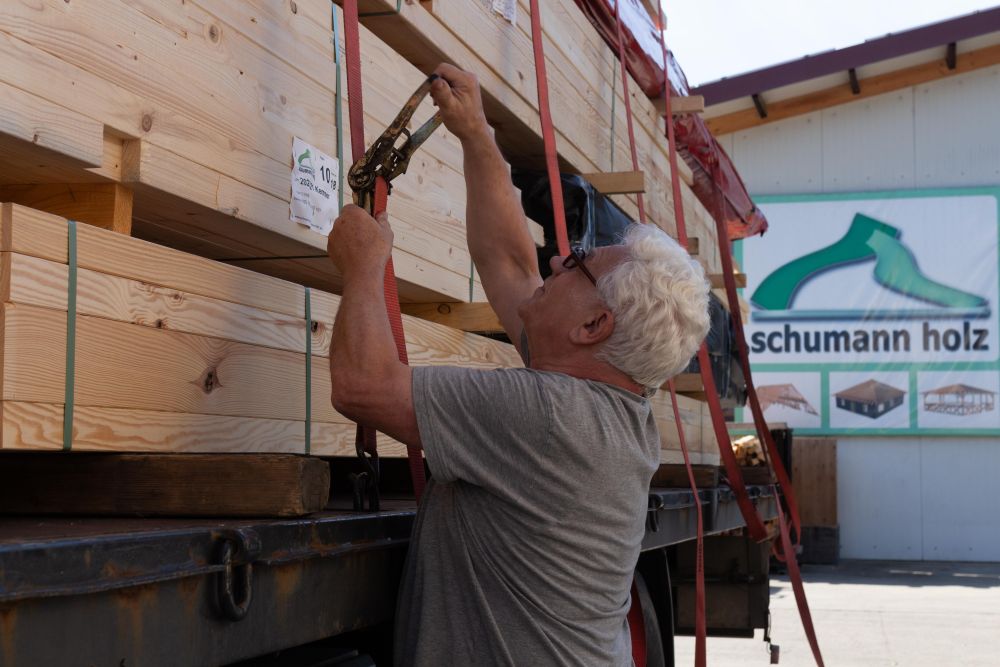 Bevor die Bauteile in die jeweiligen Pakete gestapelt werden, werden sie kontrolliert. Auf Wunsch können im Sichtbereich Dachvorsprünge nachgehobelt oder Kanten zusätzlich gefast werden.