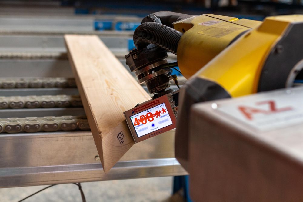 Um die exakte Beschriftung aller Bauteile zu gewährleisten, ist bei uns unser selbstentwickelter Druckroboter im Einsatz. Egal ob Schmiege, Zapfen oder Ausfräsung, das jeweilige stirnseitige Druckfeld wird ermittelt und mittels Druckkopf auf dem Druckroboter bedruckt. Dabei sind neben der Bauteilnummer auch das zugehörige Bauteilelement und weitere Informationen als Druck auf der Stirnseite möglich. Dadurch wird das Auffinden der Bauteile im Paket enorm vereinfacht.