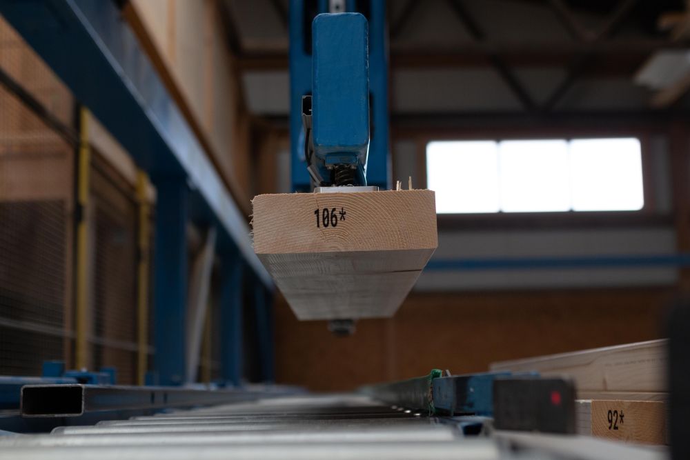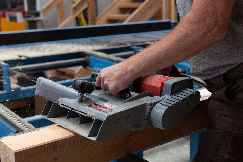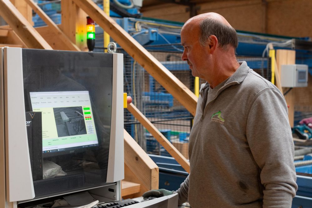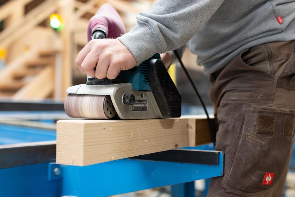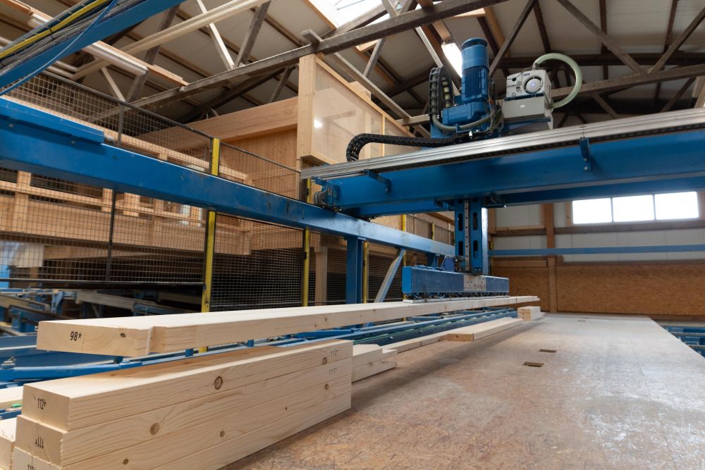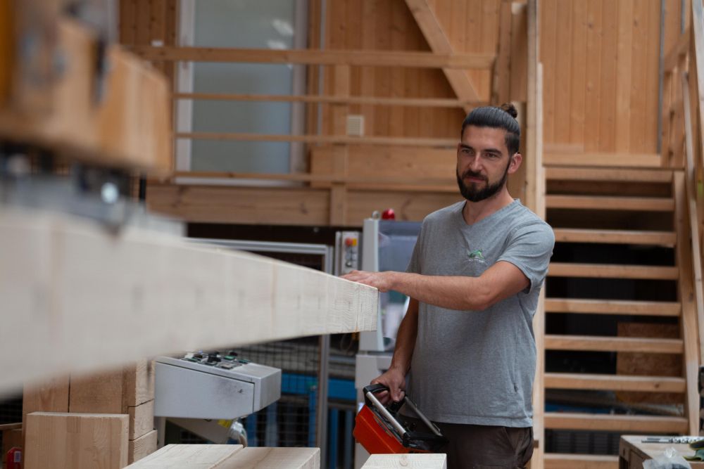 Bevor die Bauteile in die jeweiligen Pakete gestapelt werden, werden sie kontrolliert. Auf Wunsch können im Sichtbereich Dachvorsprünge nachgehobelt oder Kanten zusätzlich gefast werden.