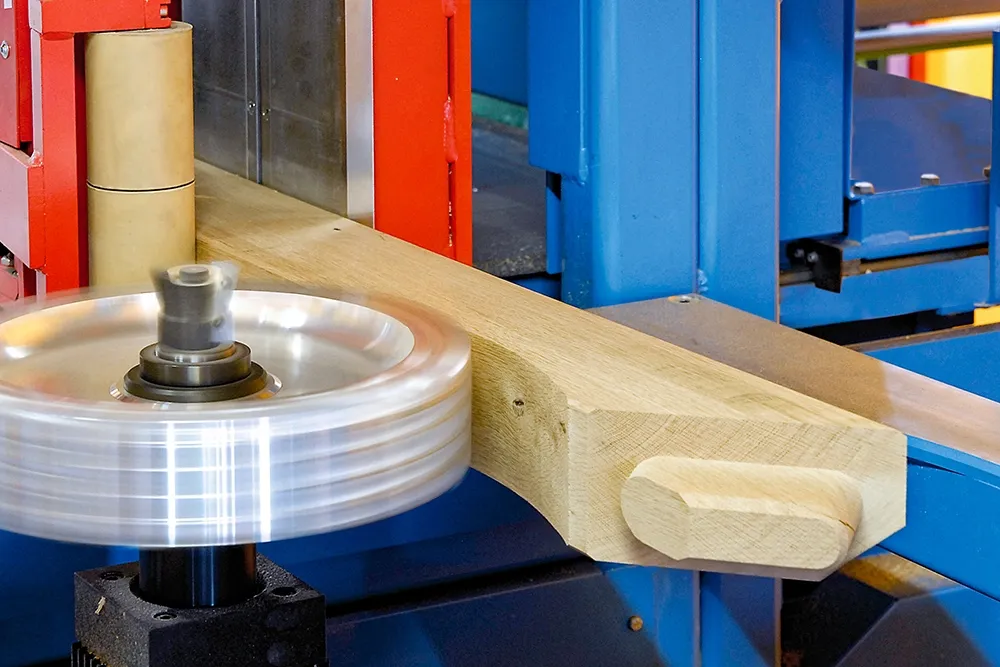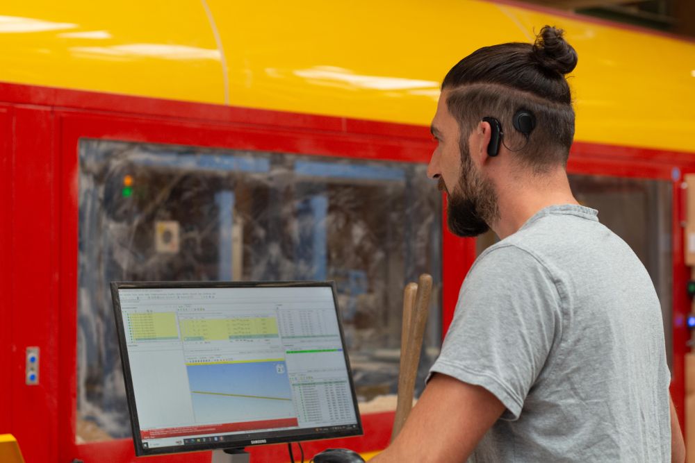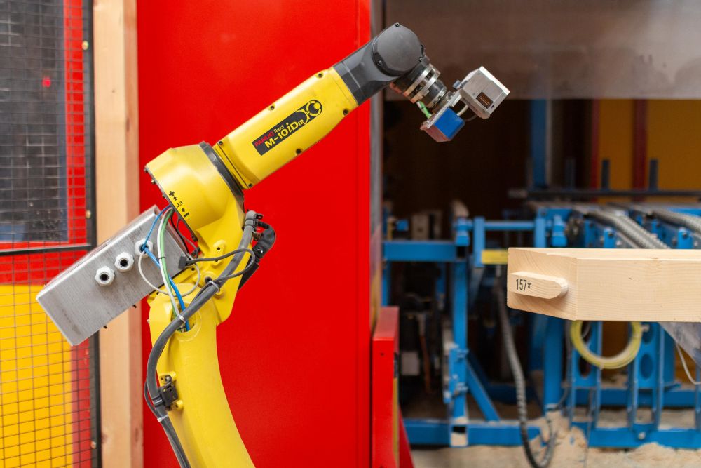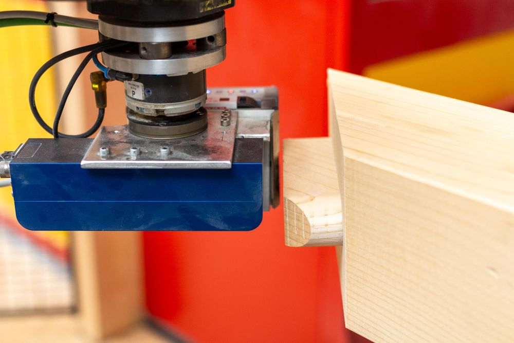 Um die exakte Beschriftung aller Bauteile zu gewährleisten, ist bei uns unser selbstentwickelter Druckroboter im Einsatz. Egal ob Schmiege, Zapfen oder Ausfräsung, das jeweilige stirnseitige Druckfeld wird ermittelt und mittels Druckkopf auf dem Druckroboter bedruckt. Dabei sind neben der Bauteilnummer auch das zugehörige Bauteilelement und weitere Informationen als Druck auf der Stirnseite möglich. Dadurch wird das Auffinden der Bauteile im Paket enorm vereinfacht.