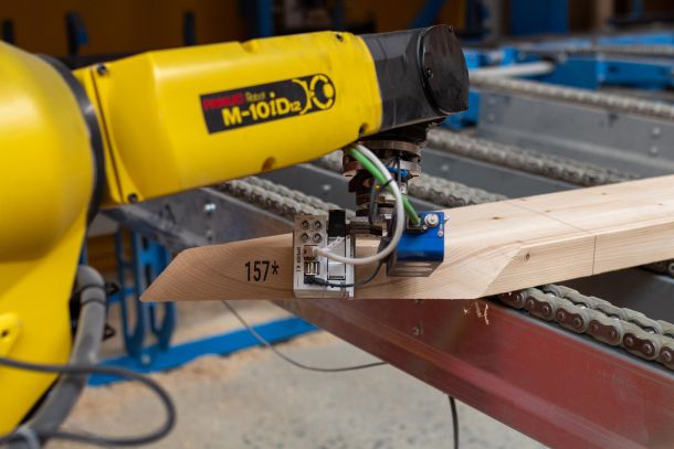 Mit der Eigenentwicklung eines Beschriftungsroboters können wir die von der Hundegger Abbundanlage ausgestoßenen Bauteile stirnseitig beschriften. Eine vorheriges Scannen der Bauteile ermöglicht auch den Aufdruck auf Zapfen und Schifterschnitten.